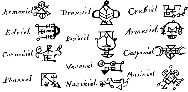 Я заклинаю тебя, О, могущественный и сильный князь Пирихиел, который странствует и т.д. Пятый странствующий князь - Эмониел (Emoniel) имеет 100 князей и главных герцогов, помимо 20 младших герцогов и множества прислужников. Но мы упомянем лишь 12 главных князей или герцогов, которые имеют 1320 подчиненных им герцогов и других прислужников. Все они очень любезные и охотно повинуются. Считается, что они обитают в лесах, их следует вызывать и днем, и ночью, в соответствии с планетарными часами. Вот их имена и печати: Печать Эмониела: