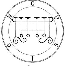 Одиннадцатый Дух - великий и сильный Герцог, зовется ГАСИОН (Gusion). Он является подобно Ксенофилу (Xenopilus, очевидно, имеется в виду Ксеноцифалу - человек с головой собаки - прим. перев.). Он рассказывает все о настоящем, прошлом и будущем. Он может показать решение любого вопроса, который ты ему задашь. Он располагает к дружбе и разрушает ее, а также дает честь и величие любому. Он управляет более чем 40 Легионами Духов. Вот его Печать, которую ты должен носить так же, как описано выше.