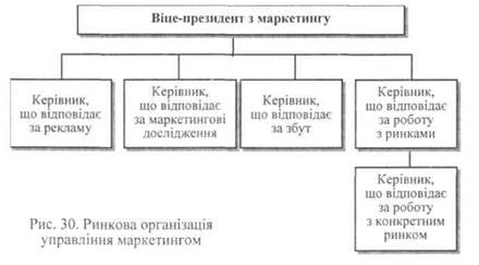 Рис. 29. Товарна організація управління маркетингом Керівники, що відповідають за групи товарів і окремі товари, розробляють відповідні маркетингові програми і контролюють їх виконання. Така організаційна схема уможливлює достатньо оперативне реагування на вимоги ринку до товару. Проте розширення товарної номенклатури потребує збільшення кількості керівників. Ринкова організаційна структура застосовується у разі діяльності підприємства на різних за характером ринках (рис. ЗО). У цій структурі, поряд з керівниками за окремими функціями є керівники за різними ринками. Кожен з них розробляє плани реалізації продукції на своєму ринку і контролює їх виконання. Така структура дає змогу приділити якнайбільшу увагу роботі зі споживачами. Товарно-ринкова організаційна (змішана) схема застосовується тоді, коли продуцент виробляє широкий асортимент товарів і працює з великою кількістю ринків. У цій структурі є окремі керівники як за ринками, так і за товарами.