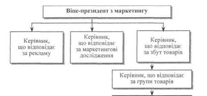 Організація управління товаром на виробництві маркетингової орієнтації може мати багато варіантів. Вона залежить від специфіки підприємства, його потужності, номенклатури продукції, кількісних і якісних характеристик ринку, на якому функціонує фірма. На думку Ф. Котлера, головними варіантами організаційних структур служби маркетингу на підприємстві можуть буш: функціональна, товарна, ринкова, товарно-ринкова (змішана). Функціональна організація є найефективнішою для фірм з обмеженою номенклатурою товарів, котрі реалізуються на невеликій кількості ринків, або для фірм, що виробляють схожу продукцію чи мають одну домінуючу асортиментну групу (рис. 28).