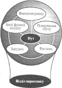 Інколи на підприємствах створюється невеликий незалежний відділ з різних спеціалістів, котрі керують усіма процесами розробки нового товару. Венчурна група (від англ. уепШге — ризик) — це підрозділ, спеціально створений для розробки, виробничого освоєння і початкового проникнення на ринок з принципово новою продукцією або послугою. Внутрішні венчури виділяються зі структури корпорації на час (до двох років) розробки та комерційного освоєння інноваційного продукту. Протягом цього терміну венчурному підрозділу передається багато організаційних, управлінських, фінансових і юридичних прав, а його розпорядження стають обов'язковими для інших підрозділів фірми. Для стимулювання творчої ініціативи співробітників, що працюють у венчурних групах, добір її учасників здійснюється на добровільних засадах. їм дозволяється залучати власні кошти на умовах участі в потенційному прибутку підприємства в разі комерційного успіху інновації. Венчурна група закінчує свою діяльність після створення і виведення на ринок нового продукту. Ці класифікаційні ознаки організаційних схем управління продуктом є досить поширеними, але не єдиними. Японська промисловість, наприклад, користується іншими напрямами організаційної структури служб маркетингу та управління продуктом: розмежувальним та інтеграційним. Перший напрямок пов'яза ' відділу маркетингу Здебільшого такий відділ маркетингу має підрозділи: вивчення ринку, планування збуту, реклами, купівельного кредиту, загальний підрозділ. За інтегрованою схемою частина функцій маркетингу передається іншим, пов'язаним з ним відділам (рис. 32).