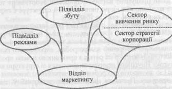 Рис. 32. Структура інтегрованого відділу маркетингу У цьому разі відділ маркетингу має тільки підрозділи: реклами, збуту, сектори вивчення ринку та стратегії корпорації. Найважливішою функцією такого відділу маркетингу є визначення стратегії корпорації. У промислових концернах, що складаються з багатьох фірм із власними підрозділами маркетингу, координація їх діяльності здійснюється зі штаб-квартири віце-президента концерну. Він визначає політику маркетингу в цілому для концерну. Так, на цьому рівні здійснюються ринкові дослідження, розробляється стратегія науково-технічного розвитку, організуються рекламні кампанії, виставки, ярмарки, сервісне обслуговування, навчання кадрів. Незалежно від особливостей організаційної побудови відділів маркетингу їх головне призначення, на думку американського економіста Пітера Друккера, полягає в тому, щоб: «Поставити фахівців з маркетингу на початку, а не в кінці виробничого циклу та інтегрувати маркетинг у кожну фазу бізнесу; визначити і довести до кожного інженера, конструктора, виробничника, яким клієнт бажає бачити продукт, яку ціну він готовий заплатити, де і коли знадобиться цей продукт. Маркетинг має впливати на проектування, планування випуску, економічний аналіз так само, як і на розподіл, збут і надання послуг щодо продукту». За умов перехідної економіки України, на більшості великих підприємств окрема служба маркетингу створюється вперше. Організаційно вона має підпорядковуватися директору підприємства, що забезпечує її незалежність від інших функціональних підрозділів, а також об'єктивну оцінку можливостей підприємства для розробки маркетингової політики. Маркетингова служба взаємодіє з усіма підрозділами підприємства, котрі беруть участь у досягненні його виробнично-комерційних цілей, а саме: відділами головного конструктора та технолога, технічного контролю й матеріально-технічного постачання, економічним та юридичним відділами, центральною бухгалтерією, а також відділом автоматизованих систем управління виробництвом. Взаємодіючи з відділами головного конструктора і головного технолога служба маркетингу готує такі дані: — кількісні та якісні вимоги потенційних та реальних споживачів до нової продукції; — план заходів з комерційної реалізації та технічного обслуговування продукції; — вартісні обмеження ціни виробу, які визначаються ринковими умовами, а також виробниками аналогічної продукції. Водночас конструкторські та технологічні відділи передають службі маркетингу всю інформацію щодо розробки та виробництва перспективної продукції, зокрема: — про реальний стан і можливості підприємства зі створення нової техніки і технології; — рівень кваліфікації фахівців; — конструкторські, ресурсні та інші обмеження та чинники, що впливають на ефективність діяльності служби маркетингу. Взаємодія служби маркетингу з відділом технічного контролю стосується питань підвищення якості та надійності продукції. З економічними відділами та бухгалтерією служба маркетингу має відносини щодо: — розробки заходів зі впровадження передової техніки; — організації виробництва; — визначення економічної ефективності нової продукції та технологій; — аналізу діяльності підприємства; — розробки перспективних та поточних планів економічного і соціального 