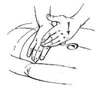 Затем те же самые движения массажист выполняет большим пальцем, опираясь на все остальные. Направление движения то же — снизу вверх (рис 7). Если массажист встает справа от массируемого, пальцы его правой руки должны быть обращены вниз, но направление массажа (снизу вверх.) должно быть неизменным. Если массаж выполняется одной рукой, вторую руку надо положить на массирующую руку для регулирования давления (рис. 8). При втором способе сверления массажист может стоять как справа, так и слева от массируемого. Подушечками больших пальцев, расположенных по обе стороны от позвоночника, он выполняет винтообразные движения в сторону позвоночника (рис. 9). Остальные пальцы при этом могут выступать в качестве опоры или просто передвигаться за большими пальцами по телу массируемого. Движение от сегмента к сегменту — снизу вверх. Рисунок 8.