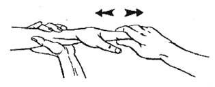 Массаж между костями Массаж вокруг лучезапястного сустава Массаж тыльной стороны кисти Массирование пальцев Положить предплечье массируемой руки на ладонь своей левой руки. Поддерживая предплечье, большим и указательным пальцами правой руки захватить мизинец и массировать его круговыми движениями от основания до кончика пальца. Так же нужно поступить с остальными пальцами руки (рис. 131). Повернуть массируемую кисть ладонью вниз и обхватить ее обеими руками. Затем необходимо положить большие пальцы своих рук на тыльную сторону масса Рисунок 131.