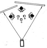 локализации. Так же обстоит дело и с микрофоном правого канала. Еще один вариант перекрестного включения микрофонов показан на рис. 25. Здесь микрофон среднего канала отведен несколько назад. Это сделано для того, чтобы каждый из микрофонов находился на равном расстоянии от актера, которому он предназначен. Своеобразную роль при многоканальной записи приобретают индикаторы модуляции, они помогают контролировать звуковую локализацию. Слуховой контроль при помощи головных: телефонов не даёт исчерпывающей информации о направленности звука. Хотя через два наушника и можно слышать сигналы, передаваемые всеми каналами, излучателей звука здесь все-таки два, тогда как при де-