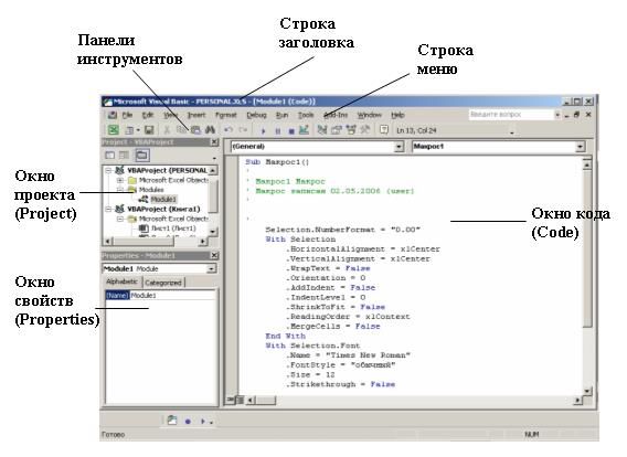 Макросы VBA сохраняются как часть файлов, в которых приложения Office (Word, Excel и т.д.) содержат свои данные. Макросы сохраняются в специальной части файла данных, называемой модули (Modules). Модуль VBA содержит исходный код макроса – текстовое представление инструкций. Для изменения исходного кода макроса используется редактор Visual Basic Editor (VBE), который представляет собой среду разработки новых и редактирования существующих программ (макросов) и процедур языка Visual Basic для приложений (VBA). Редактор Visual Basic включает полный набор средств отладки, обеспечивающих обнаружения ошибок синтаксиса, ошибок выполнения и логических ошибок в программах. Редактор VBE представляет собой отдельное приложение, запускающееся только в программах MS Office. Модули VBA, т.е. место, где храниться код макроса на языке VBA, сохраняется вместе с файлами MS Office. Запуск редактора для приложений Microsoft Office осуществляется с помощью команды Сервис}Макрос}Редактор Visual Basic либо с помощью комбинации клавиш Alt+F11 (Рис. 10). Рассмотрим структуру и основные принципы работы с VBE на примере табличного процессора Excel[1]. Интерфейс VBE состоит из следующих основных компонентов: строки заголовка, строки меню, панели инструментов, окна проекта, окна свойств, окна кода и других окон.
