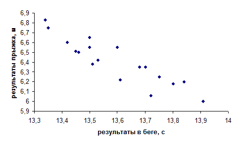 Полученное значение коэффициента корреляции позволяет подтвердить предварительный вывод и сделать окончательное заключение – связь между исследуемыми признаками: · линейная; · отрицательная; · сильная. 4. Определим достоверность коэффициента корреляции. Предположим, что связь между результатом в беге на 100 м и прыжком в длину отсутствует (Но: r= 0). · · Находим · tрасчет > tтабл (19,6 > 2,12). Вывод: существует сильная, отрицательная статистически достоверная (р =0,95) связь между бегом с препятствиями на дистанцию 100 м и прыжком в длину. Это означает, что с улучшением результата в прыжке в длину уменьшается время пробега дистанции 100 м. 5. Вычислим коэффициент детерминации: