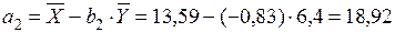 Для расчета коэффициента а2 подставим в прямое уравнение регрессии вместо b2 рассчитанное значение, а вместо Х и Y средние арифметические значения двух выборок из таблицы: