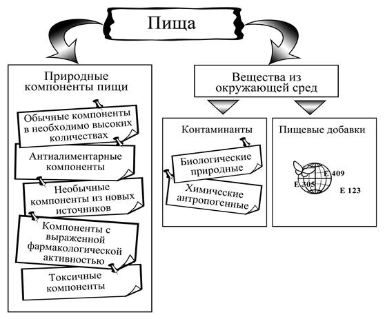 Пища – не только источник энергии, пластических веществ и других эссенциальных факторов. Пища, и особенно пища современного Homo Sapiens – гораздо более емкое понятие, чем то, что мы привыкли себе представлять. Пища – это комплекс многих тысяч (а может быть и миллионов) веществ, каждое из которых обладает определенной биологической активностью. Трудно потребителю пищевых веществ сориентироваться в том обилии пищевых добавок, которые присутствуют практически в любом пищевом продукте. Пищевые добавки присутствуют даже в так называемых "экологически чистых продуктах". Применение пищевых добавок находится под постоянным контролем национальных и международных организаций, обеспечивающих надежность пищевых продуктов в отношении их безопасности. Другая проблема, связанная с экологической безопасностью пищевых продуктов – возможное загрязнение пищевых продуктов контаминантами (пестициды, соли тяжелых металлов, радионуклиды, микотоксины, остаточные количества ксенобиологических анаболиков или компоненты упаковочных материалов и др. ксенобиотиков). Ведь в отличие от пищевых добавок, применение которых строго регламентировано, загрязнение пищевых продуктов и пищевого сырья ксенобиотиками предсказать практически невозможно (Рис.1). Ксенобиотики – любые сложные чужеродные вещества для внутренней В современной пищевой промышленности находят применение различные способы улучшения качества пищевых продуктов и совершенствования технологического процесса. Наиболее экономически выгодным и легко применимым оказалось применение пищевых добавок, в результате чего они получили широкое распространение во многих странах. В большинстве случаев под пищевыми добавками понимают группу веществ природного или искусственного происхождения, используемых для усовершенствования технологии, получения продуктов специализированного назначения, сохранения или придания пищевым продуктам необходимых свойств, повышения стабильности или улучшения органолептических свойств пищи. К пищевым добавкам не относятся вещества, повышающие пищевую ценность продуктов (витамины, минеральные вещества, аминокислоты). Не являются пищевыми добавками и посторонние загрязняющие вещества (контаминанты), непреднамеренно попадающие в пищевые продукты из окружающей среды. Большинство пищевых добавок не имеют пищевого значения и в лучшем случае являются биологически инертными для организма, а в худшем – оказываются биологически активными и небезразличны для организма. Применение пищевых добавок в этой связи допустимо лишь в тех случаях, если они даже при длительном использовании не угрожают жизни человека. Следует вести разговор о безвредности пищевых добавок, под которой понимают не только отсутствие отдаленных последствий, но и отсутствие канцерогенных и коканцерогенных свойств (способность вызывать злокачественные опухоли, мутации, уродство и т.д.). Учитывая, что взрослые люди, дети, пожилые и старики, беременные и кормящие женщины имеют различный уровень чувствительности и реактивности (защитных сил), проблема применения пищевых добавок приобретает еще большее гигиеническое значение. Немаловажным фактором является также возможное взаимодействие тех или иных веществ, применяемых в качестве пищевых добавок с вредными веществами, попада