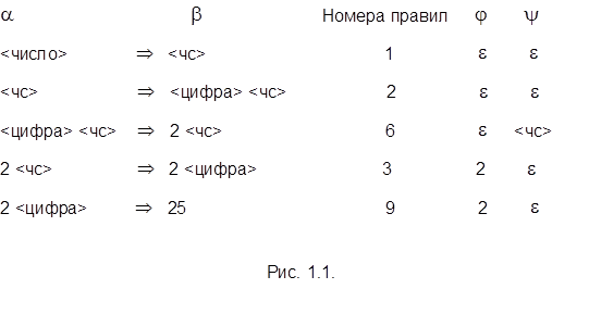 Пример 1.2. Грамматики целого числа без знака содержат следующие 13 правил (1) <число>::=<чс> S ® A (2) <чс>::=<цифра><чс> A ® AB (3) <чс>::=<цифра> A ® B (4) <цифра>::=0 B ® 0 (5) <цифра>::=1 B ® 1 (6) <цифра>::=2 B ® 2 (7) <цифра>::=3 B ® 3 (8) <цифра>::=4 B ® 4 (9) <цифра>::=5 B ® 5 (10) <цифра>::=6 B ® 6 (11) <цифра>::=7 B ® 7 (12) <цифра>::=8 B ® 8 (13) <цифра>::=9 B ® 9 Заметим, что грамматики G(<число>) и G(S) определяют один и тот же язык и отличаются только именами нетерминалов и вторым правилом