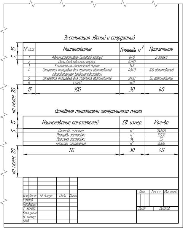 Рисунок Б.1 – Размеры и пример заполнения спецификации ПРИЛОЖЕНИЕ В (справочное) Форма и расположение на листе экспликации зданий и сооружений и таблицы показателей генерального плана