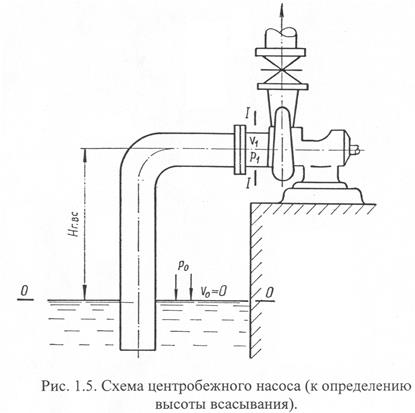 Различают геометрическую и вакуумметрическую высоту всасывания. Геометрическая высота всасывания Нг.вс представляет собой разность отметок двух горизонтальных плоскостей, одна из которых проходит через точку полости всасывания насоса (как правило это ось насоса), а вторая совпадает со свободной поверхностью перекачиваемой жидкости в приемном резервуаре или источнике. Для определения высоты всасывания