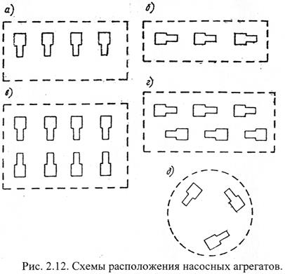 Размещение насосных агрегатов в здании насосной станции должно обеспечивать надежность действия основного и вспомогательного оборудования, а также удобство, простоту и безопасность его эксплуатации. Оборудование компонуется исходя из минимальной протяженности внутристанционных трубопроводов. Схема размещения агрегатов в здании насосной станции определяется типом, размерами и числом основных насосов. Наиболее распространены следующие схемы расположения агрегатов в зданиях насосных станций (рис.2.12): а) однорядное, перпендикулярно продольной оси здания; б) однорядное, параллельно продольной оси здания; в) двухрядное; г) двухрядное в шахматном порядке; д) концентрическое (в здании круглой формы в плане).