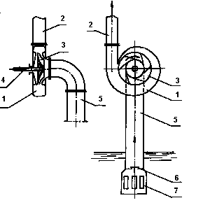 Рис.7.2. Схема центробежного насоса: 1 – корпус; 2 – нагнетательный трубопровод; 3 – рабочее колесо; 4 – вал; 5 – всасывающий трубопровод; 6 – обратный клапан; 7 – фильтр.