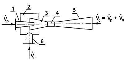 Рис.7.12. Схема струйного насоса: 1 - сопло; 2 - камера смешения; 3 - конфузор; 4 - горловина; 5 - диффузор; 6 - всасывающий патрубок;