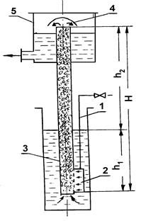 Рис.7.13. Схема газлифта: 1 - труба для подачи сжатого газ; 2 - распределитель газа; 3 - подъемная труба; 4 - отбойник (для отделения газа от жидкости); 5 - сборник жидкости; h1 -высота столба поднимаемой жидкости; h2 - высота барботажного слоя над уровнем чистой жидкости; H = h1 + h2 - высота подъемной трубы.