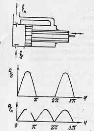 Рис. 33. Схема и графики мгновенной подачи насоса с дифференциальным поршнем