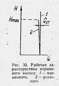 После интегрирования и вычислений найдем ∆ V ж= 0,55 SL, и объем газа в колпаке Аналогичные расчеты, выполненные для насоса двойного действия, дают Рабочая характеристика поршневого насоса Производительность теоретического поршневого насоса (см. уравнение 42) не зависит от давления, создаваемого насосом, или от его напора. Поэтому в координатах H —Q основная характеристика описывается уравнением QT=const (рис. 39, линия 1). В действительности же в реальном насосе с ростом создаваемого давления возрастают утечки, Высота всасывания поршневого насоса . Этот вопрос для насоса без воздушного клапана был ранее рассмотрен в[3].