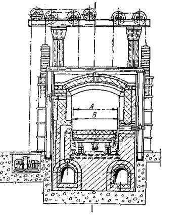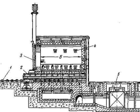 Печи камерные с выдвежным подом с заслонкой (рис. 5.3) используют для нагрева заготовок под ковку. Загрузка на под и снятие заготовок с пода осуществляются с помощью средств цеховой механизации (обычно мостовыми кранами). Печи устанавливают на специальный фундамент, являющийся общим для печи и для рельсовых путей выдвижного пода (внутри печи и вне ее). В фундаменте предусматривают приямки для размещения механизмов выдвижения пода и подъема заслонки. Для того чтобы под можно было выкатить на значительное расстояние, например в соседний пролет, применяют механизм выкатки с грузовой цепью в качестве тягового органа.