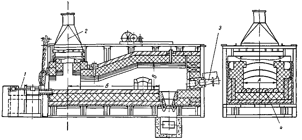 Рис. 5.4. Печь нагревательная кузнечная с желобчатым подом с выдачей заготовок НУОЖ: 1 – загрузочный толкатель; 2 – вытяжной зонт; 3 – горелка; 4 – желобчатый под; А, В, Б – рабочее пространство
