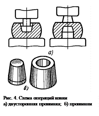 Прошивка — операция получения полостей в заготовке за счет вытеснения металла (рис.4 а). Прошивкой можно получить сквозное отверстие или углубление (глухая прошивка). Инструментом для прошивки служат прошивни (рис. 4 б) сплошные и пустотелые; последними прошивают отверстия большого диаметра (400 — 900 мм). Более толстые поковки прошивают с двух сторон без подкладного кольца. Диаметр прошивня выбирают не более 1/2 — 1/3 наружного диаметра заготовки. Прошивка сопровождается отходом (выдрой). Отрубка — операция отделения части заготовки по незамкнутому контуру путем внедрения в заготовку деформирующего инструмента — топора. Гибка — операция придания заготовке изогнутой формы по заданному контуру. Этой операцией получают угольники, скобы, крючки, кронштейны и т. п. Гибка сопровождается искажением первоначальной формы поперечного сечения заготовки и уменьшением его площади в зоне изгиба, называемым утяжкой. Для компенсации утяжки в зоне изгиба заготовке придают увеличенные поперечные размеры. При гибке возможно образование складок по внутреннему контуру и трещин по наружному. Во избежание этого явления по заданному углу изгиба подбирают соответствующий радиус округления. Перечисленными операциями ковки трудно изготовить поковки с относительно сложной конфигурацией.