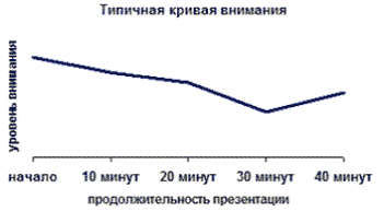 Нашему сознанию требуется некоторое время, чтобы хотя бы просто осмыслить картинку, которая появилась перед глазами. Человек успевает заметить изменение окружающей ситуации приблизительно за 0,1 - 0,3 секунды. Этого времени вполне достаточно для того, чтобы понять, что изображено, но не достаточно для того, чтобы вчитаться и осознать, осмыслить, зачем это появилось перед глазами. Для того чтобы вчитаться и осознать, нужно времени значительно больше – в два, а то и в три раза – в зависимости от объема информации, степени ее сложности и особенностей представления на слайде. Итак, основной критерий, по которому определяется время на демонстрацию слайда, – это особенности самого слайда (текстовая или графическая информация, ее объем, насыщенность слайда анимационными эффектами и пр.) Эмпирически установлено, что для демонстрации одного слайда на экране необходимо от 20 секунд до 3-5 минут (такая длительность нужна обычно для сложных анимационных слайдов, на которых информация появляется постепенно). Темп представления информации всегда корректируется выступающим исходя из реакций аудитории, на которые необходимо чутко откликаться. Если какая-то картинка (или слайд целиком) появилась на 5 секунд, а вы не дали возможности её рассмотреть и тут же сменили её другой, то аудитория не будет вами довольна: она будет считать, что вы её подгоняете! Планируя выступление, целесообразно помнить о так называемой «кривой внимания», отражающей особенности человеческой психики, ее способность концентрироваться и сосредоточиваться в процессе восприятия информации на слух.