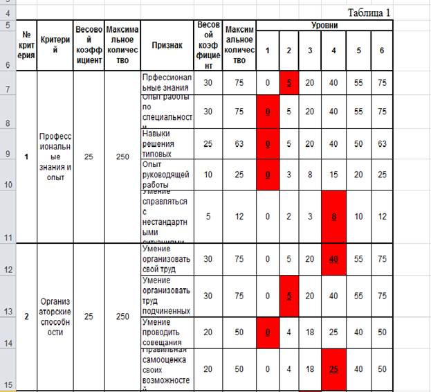 Разработаем аттестационную таблицу для кандидата в резерв на замещение должности начальника отдела управления персоналом, определив при этом, важность каждого критерия, а также важность каждого признака внутри критерия. В данной таблице я оцениваю себя, как кандидата на должность руководителя отдела управления персоналом.