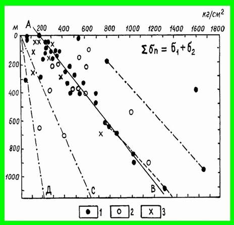 Рис.11.5.1.Изменение величины напряжений в породах складчатого и кристаллического фундамента с глубиной: 1-фундамент древних платформ,2-складчатые пояса палеозойской консолидации,3-области мезозойской и кайнозойской складчатости,ОС-линия геостатического давления,АВ-избыточные напряжения по Н.Харсту