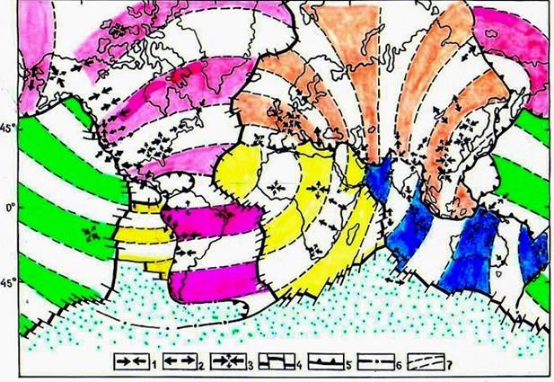 Рис. 11.5.2.Генерализованная карта напряжений в литосфере (Woorld Stress map): 1-сжатие с образованием взбросов и надвигов,2-растяжение с образованием сбросов,3- сжатие с образованием дигональных сдвигов; границы литсферных плит:4-дивергентные,5-конвергентные,6-неуверенная граница,7-траектории абсолютного движения плит согласно модели NUVEL