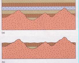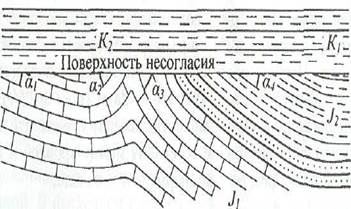 Рис. 11.5.3.Угловое – слева (изменение величины угла несогласия в разных частях складки) и эрозионное - справа несогласие