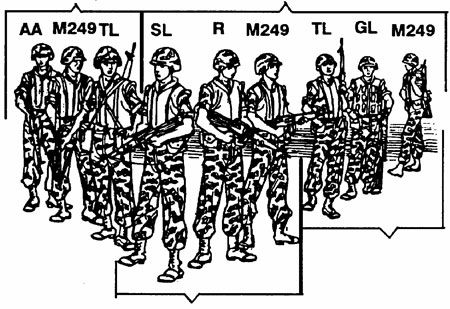 Для ведения огня на подавление назначается группа поддержки в составе трех человек. Подгруппы захвата, используя маневр, зачищают комнату за комнатой. Ручные пулеметы обычно используются группой поддержки, но также могут быть использованы группой захвата ввиду более мощного огня. Переносные установки ПТУР, обычно не используются группой захвата, из - за большого веса. Командир отделения находится в месте, обеспечивающем лучшее управление. Если отделение небольшой численности или понесло потери, приоритет отдается группе захвата в ущерб группе поддержки.