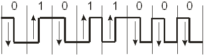 До недавнего времени являлся самым широко используемым импульсным кодом. Для кодирования битов используется перепад (фронт сигнала). Значение бита определяется направлением перепада (восходящий или спадающий фронт). Пример кодирования байта данных манчестерским кодом приведен на следующем рисунке.