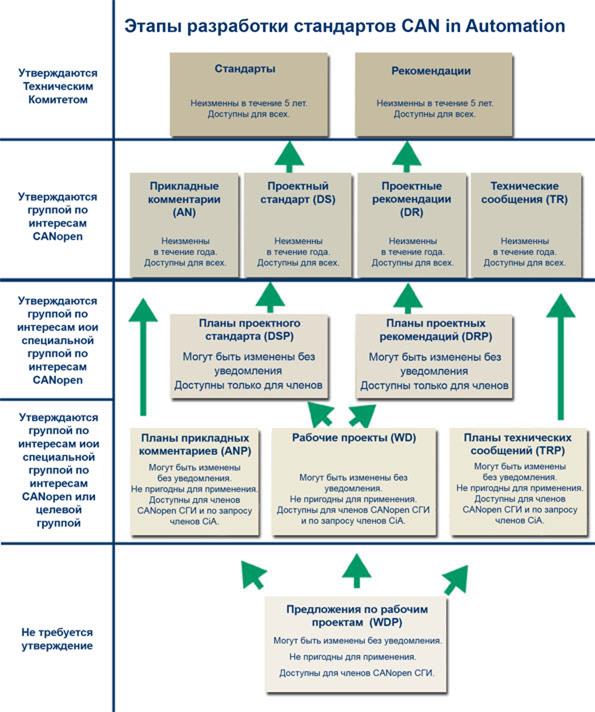 Спецификации CiA проходят разные этапы формирования и утверждения на различных уровнях в течение стандартного периода развития, как показано на рисунке 6.3. Начиная с января 2005 года, CiA предоставляет некоторые спецификации со статусом DS и DR для свободного скачивания через Интернет с вебсайта ассоциации, однако спецификации CANopen со статусом DSP, WD, WDP доступны по-прежнему только членам CAN in Automation. Это одно из преимуществ членства в ассоциации. Кроме этого, члены ассоциации имеют возможность влиять на формирование спецификаций, участвуя в работе технических групп, и получать важную и адекватную информацию прежде, чем спецификация опубликована. Некоторые из технических разработок CiA предназначены для представления в комитеты по международной стандартизации, таких как Международная Организация для Стандартизации (ISO), Международная Электротехническая Комиссия (IEC), европейский Комитет по Электротехнической Стандартизации (CENELEC), европейский Комитет по Стандартизации (CEN), и IEEE. Хотя CiA не является международной стандартизирующей организацией, её влияние на рынке CAN-технологий таково, что разработанные в ней спецификации фактически являются стандартами для производителей оборудования, использующего сети CAN. Например, для физического и канального уровней технологии CAN оформлен так называемый протокол CAL (CAN Application Layer) в спецификации DS 301. Также определены ограничения для программируемых устройств (DS 302), рекомендации по кабелям и разъемам (DS 303-1), единицы системы СИ и описание префиксов (DS 303-2). Версия 4 DS 301 стандартизована в виде европейского стандарта EN 50325-4. Упомянутые спецификации доступны без ограничений на сайте CiA.