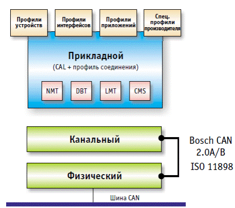 Результатом дополнения CAL системой профилей (устройств, интерфейсов, приложений и т. д.) и спецификациями физического уровня (типы соединителей, правила битового квантования, определяющие, насколько квантов разделять бит и в каком месте бита считывать его значение, и т. д.) явилось появление более детализированного стандарта протокола CANopen. По существу, CANopen является одним из приложений прикладного уровня CAL, но единственным приложением подобного рода, поддерживаемым ассоциацией СiA. Профили устройств (CiA DS 40x) упрощают интеграцию модулей разных производителей в единую сеть, а определение минимального обязательного (mandatory) набора свойств модулей гарантирует работоспособность системы на базовом уровне. Первоначально CANopen предназначался для сетей управления движущимися механизмами в системах промышленной автоматики. Однако впоследствии он нашел применение в медицине, морской электронике, на транспорте и в системах автоматизации зданий. Структура CANopen в соответствии с моделью OSI приведена на рис. 7.2. Два нижних уровня соответствуют стандарту CAN (ISO 11898, CAN Specification 2.0 A/B).