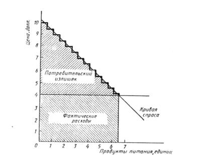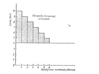 Потребители покупают товары, потому что покупки делают их жизнь лучше. Потребительский излишек показывает, насколько лучше в среднем станут жить отдельные люди после совершения той или иной покупки. Так как различные потребители оценивают потребление различных товаров по-разному, максимальный уровень цены, которую они готовы заплатить за эти товары, также различается. Потребительский излишек представляет собой максимальную цену, которую потребитель товара готов заплатить за покупку, за вычетом действительной цены товара. Точнее потребительский излишек является разницей между ценой, которую потребитель готов заплатить за товар, и той, которую он действительно платит при покупке. Предположим, например, что человек был готов заплатить 30000 рублей за килограмм говядины, хотя ему надо заплатить только 20000 рублей за фунт. Сэкономленные 10000 рублей за килограмм являются потребительской рентой. Когда мы сложим излишки всех потребителей, которые приобретают товар, мы получим размер совокупного потребительского излишка. Потребительский излишек может быть легко подсчитан с помощью кривой спроса. Мы можем показать соотношение между спросом и потребительским излишком, изучая отдельную кривую спроса на продукты питания на рис. 1. Построив кривую спроса так, чтобы она была похожа на лесенку, а не на гладкую прямую линию, мы можем измерить излишек, который данный потребитель получает, когда покупает продукты питания. Решая сколько продуктов питания закупить, потребитель может произвести следующие подсчеты. Так как цена продовольствия равна 4 тыс. рублей за килограмм, стоимость первого килограмма продовольствия равна 4 тыс. рублей, но его “ценность” для потребителя - 10 тыс. рублей. Эта 10 тысячная оценка получена при использовании кривой спроса, которая помогает определить максимальную цену, которую потребитель заплатит чтобы приобрести дополнительную единицу продовольствия (10 тыс. - максимум, который данный потребитель готов заплатить для приобретения первого фунта продовольствия). В этом случае продукты питания стоит купить, потому что цена на 6 тыс. рублей меньше максимально возможной цены и, таким образом, они дают избыточную стоимость. Второй килограмм продовольствия также стоит приобретать, так как это дает избыточную стоимость в 5 тыс. рублей (9 тыс. - 4 тыс.). Третий килограмм продуктов питания дает излишек в 4 тыс., четвертый дает излишек лишь в 3 тыс., пятый - в 2 тыс., шестой - в 1 тыс.. Соответствующим образом потребитель безразличен к приобретению седьмого килограмма продовольствия (он дает нулевой излишек) и предпочитает не покупать больше продовольствия, так как ценность каждого следующего килограмма меньше его цены. На рис. 1 потребительский излишек получается сложением избыточной стоимости по всем закупаемым единицам. В данном случае потребительский излишек = 6 тыс. + 5 тыс. + 4 тыс. + 3 тыс. + 2 тыс. + 1 тыс. = 21 тыс. рублей. Кривая спроса имеет наклон вниз в силу того, что снижение цен на любой товар или вид услуг заставляет потребителей переключаться на него и отказываться от замещающих его продуктов. При понижении цен потребители используют данный товар в больших количествах, покупая, таким образом, единицы с более низкой предельной ценностью. Чем ниже цена килограмма продовольствия, тем больше продуктов будет куплено на неделю; ч