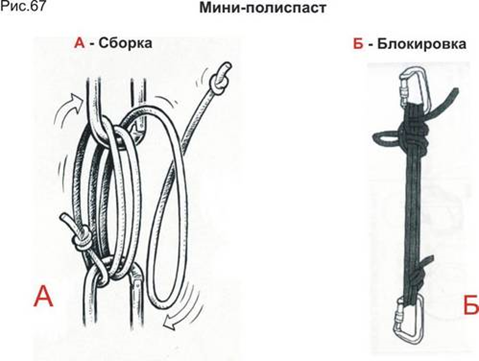 Важно! Нельзя допускать перехлестов и перекрутов в системе любого полиспаста и особенно в мини полиспасте. Использование мини полиспаста. При спасательных работах часто возникает необходимость приподнять на несколько сантиметров или десятков сантиметров тяжелый груз – для этого используются мини-полиспасты. Рисунок. Мини полиспаст удобно сделать используя корделет и два карабина. При устройстве мини-полиспаста делают 2-3 полных оборота веревки, дальнейшее увеличения количества витков не приводит к выигрышу в силе – резко увеличивается трение между ветвями веревки. Блокировка мини-полиспаста производится стандартным образом с использованием рифового и контрольного узла. См рисунок.