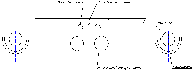 Кулебалон на маніпуляторі переміщується у першу камеру. У другій камері одночасно виконується зварювання. Тим часом у пешій камері створюється вакуум 1·10-3 мм рт.ст. Потім у камеру подається аргон з атмосферним тиском. Після зварювання у другій камері, кулебалон передається у третю камеру з аргоном. Люк між ними зачиняється. У перщій камері створюється надлишковий тиск аргону. Відчиняється люк між першою і третьою камерами. Кулебалон передається до зварювання. Люк зачиняється. Одночасно у другій камері виймається зварений кулебалон. Камера з новим кулебалоном готується для переведення нового кулебалону у третю камеру.