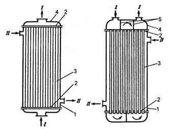 Подальшим розвитком теплообмінника «труба в трубі» є кожухотруб-ний теплообмінник (рис. 2), що також відноситься до групи рекуперативних. У зовнішню трубу (кожух -1) поміщена вже не одна труба, а пучок труб малого діаметра 3, кінці яких герметично (за допомогою зварювання або вальцювання) закріплені в трубних ґратах 2 (дошках). Трубні ґрати приварені до корпуса апарата (кожухова), і до них через ущільнювальні прокладки за допомогою болтового з'єднання приєднані кришки 4. Теплообмінник має штуцери для входу і виходу теплоносіїв, один із яких рухається по міжтрубному простору, а інший в інших трубах. Перевага апарата: компактність, можливість розвивати великі поверхні теплообміну в одному апараті, зручність в експлуатації, технологічність у виготовленні. Недолік: ускладнене очищення міжтрубного простору. Кожухотрубний теплообмінник є найбільш розповсюдженим типом теплообмінного апарата.