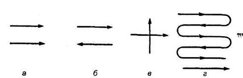 Рис. 3. Схеми руху теплоносіїв: а - прямотік; б - протитік; в - перехресна; г - змішана