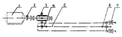 Рис.1 Схема электрического привода транспортера: 1-электродвигатель асинхронный, 2 – муфта, 3 – червячный редуктор, 4 – ведущая звездочка, 5 – втулочно-роликовая цепь, 6 – ведомая звездочка, 7 – устройство натяжения цепи