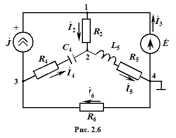 2.4.6. Метод узловых потенциалов Для рассматриваемой цепи (рис. 2.6), содержащей 4 узла, система, составленная в соответствии с методом узловых потенциалов, должна содержать 3 уравнения. Выберем в качестве опорного узел 4. Имеем: