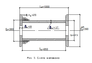 Высота реборд над последним слоем каната должна быть не менее hp = 2,5* dk во избежание сползания каната, поэтому hp=56,25 (мм). Толщина стенки барабана определяется расчетом или по эмпирической формуле: dст=0.02*Dб’+(6 ¸10) dст=0.02*337,5+10= 16,75 (мм) Пусть dст=17 (мм) Диаметр барабана по ребордам:
