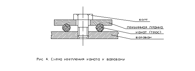 Крепление концов стальных канатов к барабанам производят, например, с помощью зажима их металлическими планками (рис.4) Диаметр барабана по центрам первого слоя навивки каната определяется в зависимости от коэффициента l, принимаемого по нормам Гостехнадзора для стреловых кранов: