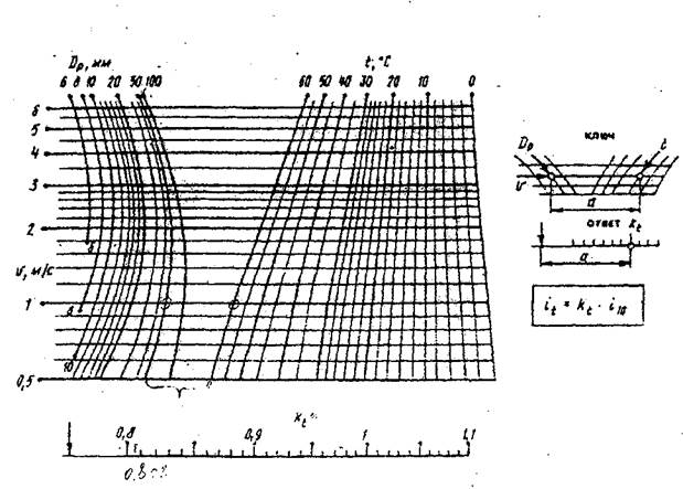 При проектировании систем водоснабжения зданий в первую очередь следует принимать трубы из полимерных материалов. В этом случае пользуются пособиями к СНиП 2.04.01-85* «Внутренний водопровод и канализация зданий» и СП40-102-2000 «Проектирование и монтаж трубопроводов систем водоснабжения и канализации из полимерных материалов», а также таблицами для гидравлических расчётов трубопроводов из полимерных материалов т.1 «Напорные трубопроводы», составленными А.Я. Добромысловым (Москва, 2004г.) По таблицам можно определить диаметр трубы и 1000 i (мм/м) зная расход (л/с) и задаваясь скоростью воды. Таблицы рассчитаны при коэффициенте шероховатости Кэ = 0,02 мм и вязкости воды при температуре 10 °С. Для определения удельных потерь напора на трение при транспортировке воды с температурой, отличной от 10 °С, рекомендуется пользоваться номограммами, по которым находим поправочный множитель Кt к значению потерь напора 1000 i, определённых по таблице. При температуре, отличной от 10°С удельные потери равны: 1000it = Кt ∙ 1000 i. (1) Для пользования номограммой (рис.) приводится ключ.