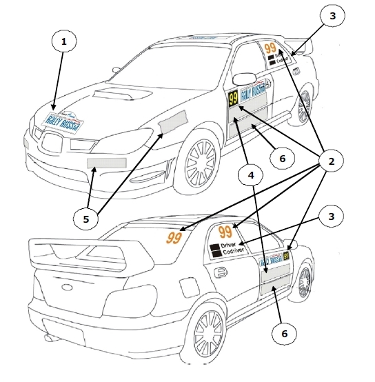 Обязательные наклейки и реклама: 1 – Наклейка с наименованием ралли (на капоте) 2 – Стартовые номера (на обеих передних дверях, обоих задних боковых стеклах и на заднем стекле) 3 – Фамилии и национальные флаги обоих Водителей (на обоих задних боковых стеклах) 4 – Ралли-плейт с обязательной рекламой (на обеих передних дверях) 5 - Реклама многоэтапного соревнования - Чемпионата, Кубка, Серии и пр. – (на переднем бампере и обоих передних крыльях) Необязательная реклама: 6 – На обеих передних дверях под ралли-плейтом * - применение номера на заднем стекле не является обязательным