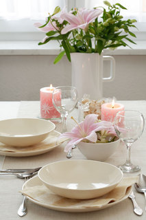 Цветы - также важная часть сервировки. Они обеспечивают простой путь украшения. Вы можете, например, разместить маленький букет на тарелке каждого гостя перед началом приема. Повторю, что детали полностью накрытого стола должны гармонировать между собой по стилю и особенно, по цвету. Искрящееся серебро и стеклянная посуда - также являются элементами, придающими законченность внешнему виду оформления. Убедитесь, что тщательно осмотрели каждый прибор и вытерли их с уксусом, чтобы придать им сияние и блеск. Идеи для великолепного стола Главное, чем вы должны руководствоваться при сервировке и оформлении стола, это определенный альянс всех деталей, которые размещаются на столе, обязательное сочетание их друг с другом. Тема сервировки может быть подсказана самой кухней – мексиканской или индийской, и во всех деталях общей нитью должен проходить выбранный мотив. Для оформления стола азиатской кухни прекрасно подойдут палочки для еды, бамбуковые циновки под тарелки, бамбуковые ростки и т.д. Но тема может быть продиктована каким-то событием: Рождеством, Пасхой, Новым Годом, Хэллоуином и всеми другими жизненными случаями, которые дают вам возможность создать роскошный праздник.