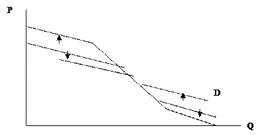 Обнаружив уменьшение спроса на свою продукцию, олигополисты в отличие от монополистических конкурентов снижают не объем выпуска, а цену. Когда одна из фирм опускает цену ниже Р, тогда ее конкуренты, обнаружив отток покупателей, тоже снизят цену и вернут потерянных покупателей. В результате инициатор снижения цены по цене Р1 (рисунок 3.2) сможет продать только Q3. Это означает, что кривая спроса на его продукцию сместилась вниз. Поэтому олигополист на рынке гетерогенного блага видит перед собой постоянно смещающуюся ломаную кривую спроса (рисунок 3.3). Таким образом, если на рынке монополистической конкуренции воздействие конкурентов на рыночную позицию отдельной фирмы проявляется в виде горизонтального смещения кривой спроса на ее продукцию, то на олигопольном рынке гетерогенного блага влияние конкурентов на рыночную позицию отдельного производителя выражается в виде вертикального сдвига кривой спроса на его выпуск.
