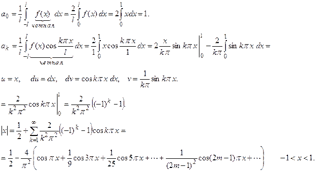 П р и м е р. Разложить функцию f(x) = |x| в ряд Фурье в интервале (-1; 1).