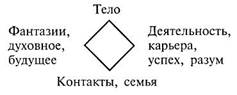 Рис. 1. Четыре сферы разрешения конфликта (актуальный конфликт) По мнению Н. Пезешкиана, человеку необходимо достичь баланса этих четырех сфер, которые являются широкими категориями и понимаются каждым человеком в зависимости от собственных представлений, желаний и конфликтов. Например, мужчина реагирует на конфликт физическими недугами (тело), женщина, имевшая негативный опыт семейной жизни или неуверенная в себе, считающая себя «дурнушкой», «уходит» в сферу деятельности, карьеры, при этом не развиваются остальные сферы, в частности сфера контактов, поэтому она одинока, не может создать семью. Только когда человек достигает баланса, он многое может сделать, в частности эффективно выстроить межличностное взаимодействие. Каким сферам будет оказано предпочтение, в какую сферу «человек уйдет», в большей степени зависит от опыта, прежде всего от того, как он действовал в детстве, где этому научился. Ответить на этот вопрос можно, изучив базовый конфликт, т.е. то, как родители относились к этим четырем сферам, какие взаимоотношения были у клиента с братьями и сестрами и т.д. (рис. 2).