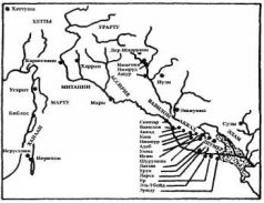 Археологами были найдены многочисленные тексты – по большей части фрагментированные – с описанием жизни богов и людей в последующие столетия. Центр империи продолжал перемещаться. В 2113 году до нашей эры началась самая славная глава в истории Шумера и Аккада. Учёные называют этот период Ур III, потому что в это время город Ур в третий раз стал столицей империи. Это был «культовый центр» Нанны/Си‑на, который жил в городе на священной территории (рис. 65) вместе со своей женой Нингаль. Их правление было просвещённым и милосердным. Царь, которому они доверили основать новую династию, Ур‑Намму, был мудрым и справедливым; при нём процветала международная торговля, позволявшая шумерам в обмен на зерно и ткани получать металлы и дерево. По свидетельству Библии яркие одежды из Ура высоко ценились даже в далёком Иерихоне. Купцы из Ура были известны во всём Древнем мире и пользовались заслуженным уважением; с их помощью разнообразные аспекты шумерской культуры становились известны другим народам. Для увеличения производства шерсти шумеры захватили обширные равнинные пастбища на севере, где был основан главный торговый форпост, служивший воротами в населённую хеттами Малую Азию. Новый город назвали Харраном – «Караван». Он должен был стать Уром в миниатюре, Уром вдали от Ура, и поэтому его планировка повторяла планировку столицы империи, а храм был копией храма в Уре. Вернувшийся из изгнания Мардук смотрел на все эти достижения с растущим чувством отчаяния и гнева. В своей автобиографии (копия её хранилась в библиотеке Ашшурбанипала) Мардук вспоминает, как после странствий по многим землям, «от восхода до заката солнца», он прибыл в страну хеттов. Там он прожил двадцать четыре года, и всё это время не переставал задавать себе вопрос: «Доколе?»